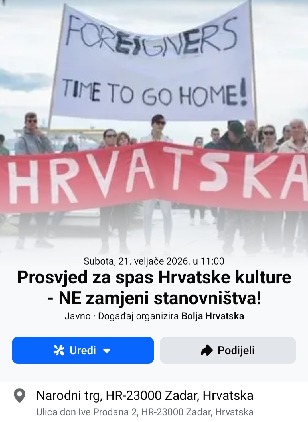 Pridružite nam se u stvaranju bolje Hrvatske, nakon održanih prosvjeda u Zagrebu, Splitu i Rijeci Udruga za bolju Hrvatsku najavljuje prosvjed u Zadru. Prosvjed za spas Hrvatske kulture - NE zamjeni stanovništva održati će se na Narodnom trgu u Zadru u subotu 21.02.2026 godine. Pridružite nam se na prosvjedu i zajedno vratimo Hrvatsku Hrvatima!